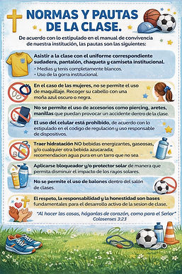 El área de Educación Física les da la bienvenida a este nuevo año 2026, invitándolos a participar activamente en cada experiencia deportiva y formativa que promueva la salud, el compañerismo y los valores cristianos, creciendo en cuerpo, mente y espíritu.